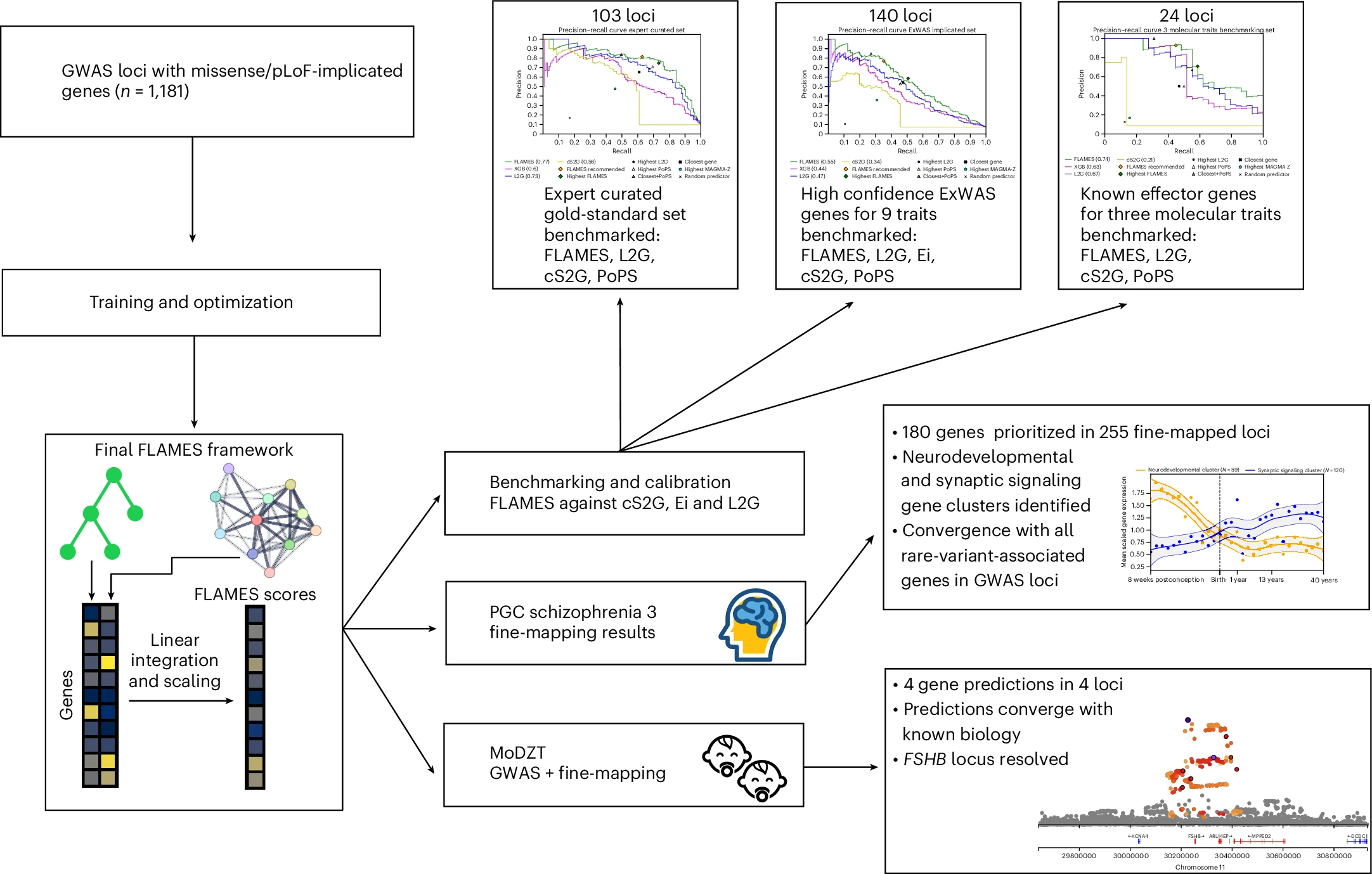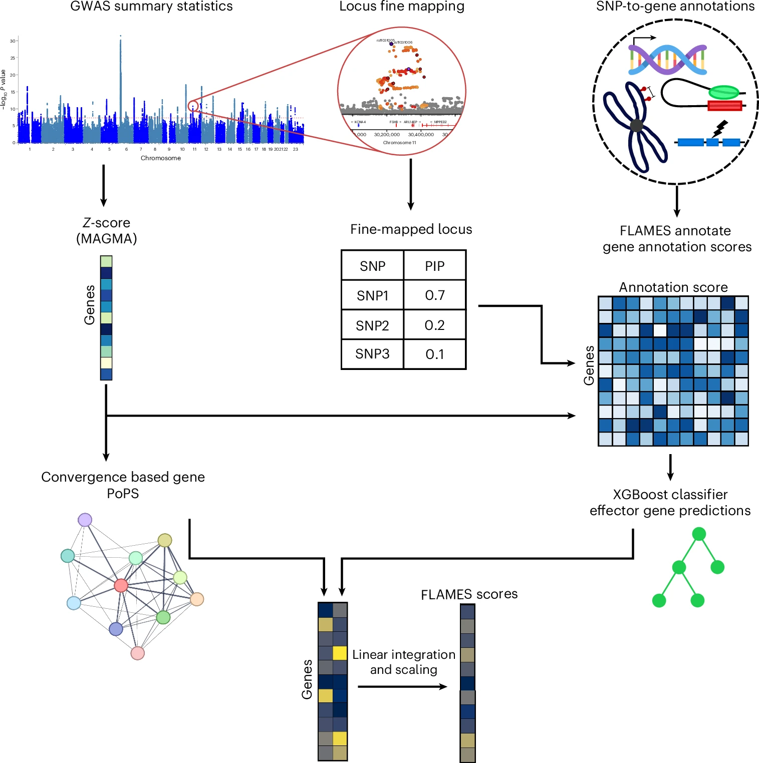 性状效应基因的多模态精细定位新策略 2025年2月17日 zd200572 写评论 科研已经进入多模态和大模型的阶段。阿姆斯特丹自由大学研究人员提出了FLAMES(效应基因的精细定位评估模型)框架,预测一个位点中最可能的效应基因。<br>FLAMES从SNP与基因的生物数据中创建机器学习模型预测,然后将预测得分与功能网络中GWAS信号收敛的以基因为中心的证据一起评估。<br>研究人员在异卵双胞胎的GWAS中解析了FSHB位点,并进一步寻找与罕见编码证据趋同的精神分裂症风险基因,这些基因与生命的不同阶段相关。 本篇文章来源于微信公众号:微因