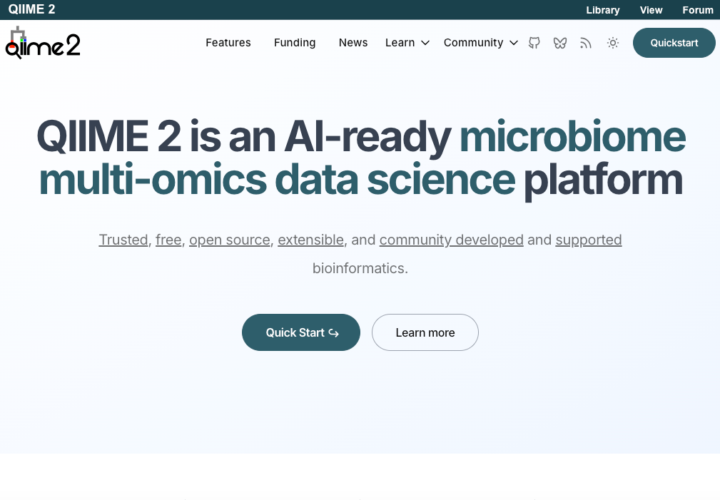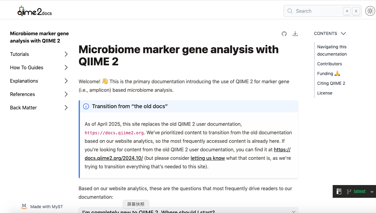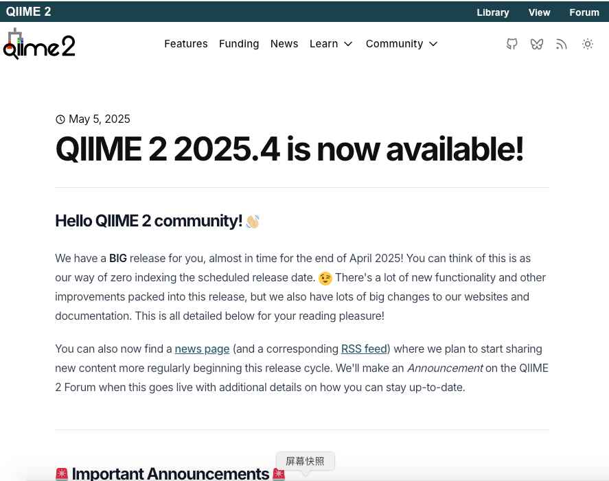 1. q2-vsearch 先前版本中的Bug(应该多数还没人使用):<br>受影响的版本2023.9、2024.2 和 2024.5 shotgun/metagenome版本。表现为 vsearch uchime-denovo 操作中嵌合和非嵌合序列分类的数量可能不正确。本次更新多数主要是宏基因组版本的。<br>2. 重新设计的主页,文档网站,从标题看到开始拥抱AI和多组学啦<br>鉴于qiime2主要还是个扩增子的分析工具,然后qiiime2已经开始涉及宏基因组的分析,拥有多个分支,官网把文档重新链接为了扩增子的版本。<br>官网默认文档:https://docs.qiime2.org/<br>宏基因组版本文档:https://moshpit.qiime2.org/en/stable/intro.html<br>原文档网站在这里:https://docs.qiime2.org/2024.10/<br>更新发布页面:https://qiime2.org/news/qiime-2-2025-4-is-now-available-33088/