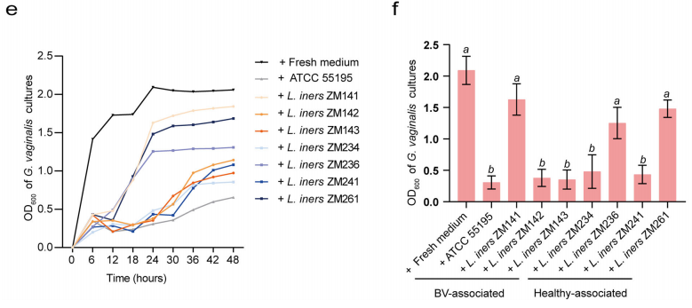 采用血平板厌氧培养,利用特异性引物鉴定L. iners。监测菌株生长曲线,评价生物膜形成能力。提取培养上清液,测定pH及抑制G. vaginalis的抗菌活性。
