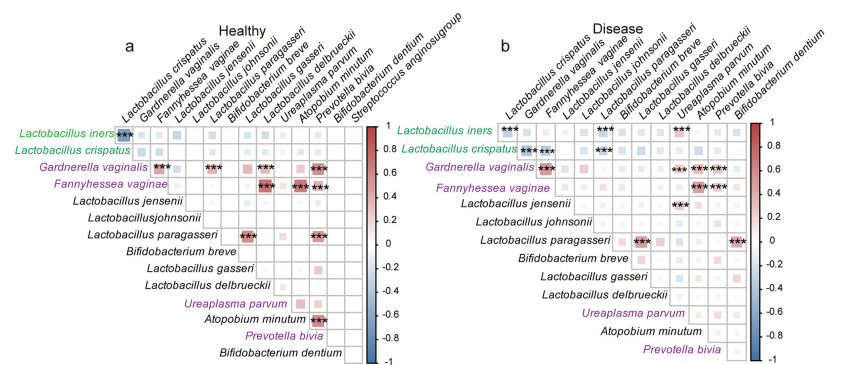 图 不同健康状态下阴道微生物群优势菌种的相关性分析