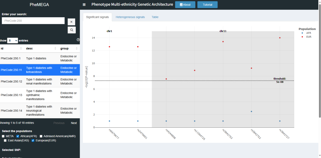 当前版本包括单一性状 GWAS 发现、单一 SNP PheWAS 发现的可视化,以及这些发现在人群中的比较,突出了少数族裔人群和欧洲人群之间存在显着差异的 SNP 性状对。