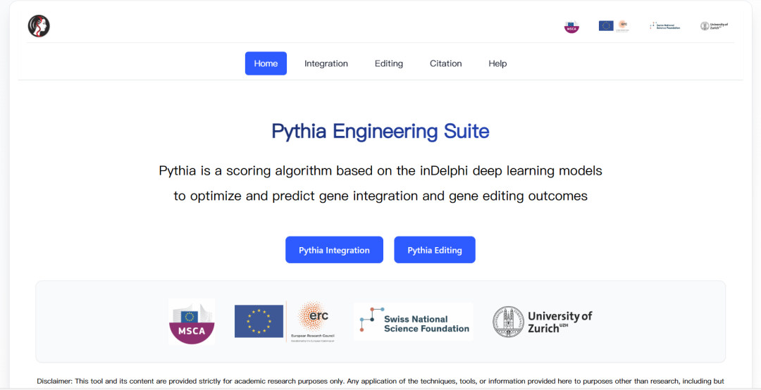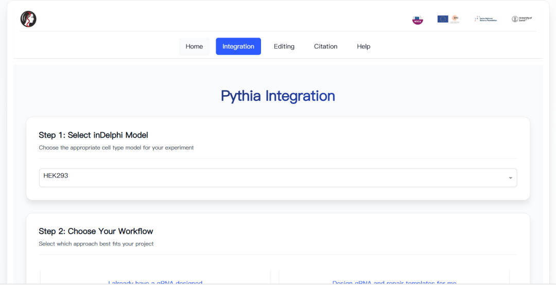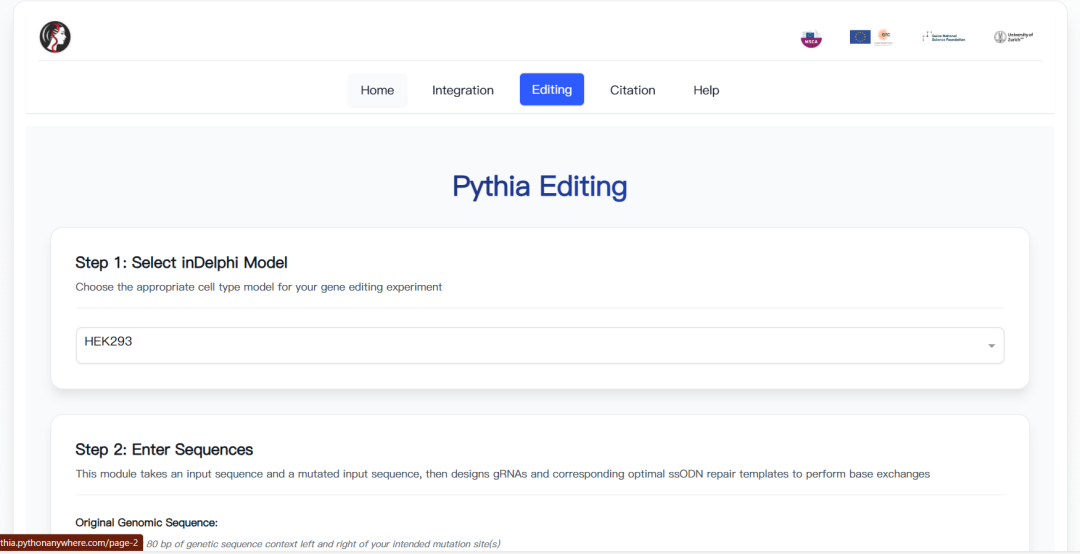 Pythia则是基于inDelphi深度学习模型的评分算法,专门用于优化和预测基因整合和基因编辑结果。作为inDelphi的延伸应用,Pythia提供了更加用户友好的界面和专门化的功能模块。它提供两个核心工具:Pythia Integration用于设计和优化基因整合策略,而Pythia Editing则用于预测和优化基因编辑结果。