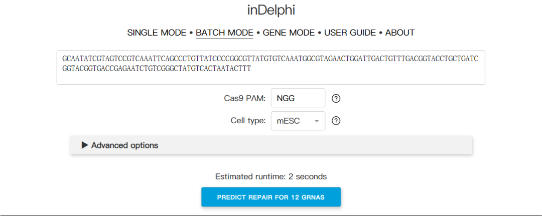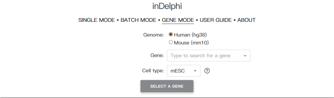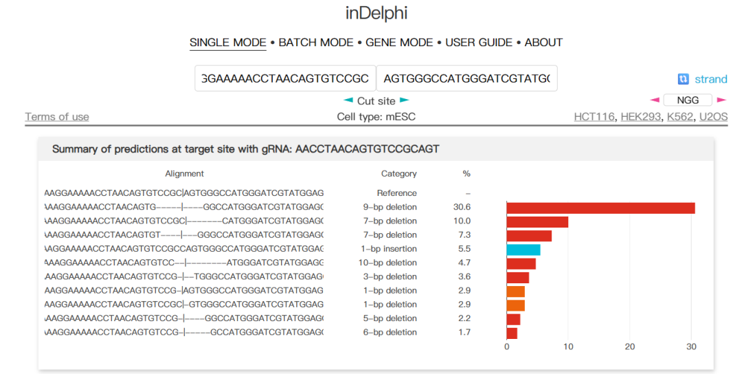 inDelphi在线交互式实现支持三种主要工作模式。单模式让用户输入序列上下文和切割位置,获得插入缺失频率预测和汇总统计;批处理模式可以输入序列上下文和PAM,获得序列上下文中与PAM兼容的所有gRNA的预测汇总统计;基因模式则允许用户输入hg38或mm10编码基因,获得靶向该编码基因的所有SpCas9 gRNA的预测汇总统计。不过需要注意的是,inDelphi主要针对SpCas9进行训练,在哺乳动物细胞类型中表现最佳,但不适用于细菌、植物和非哺乳动物真核生物。