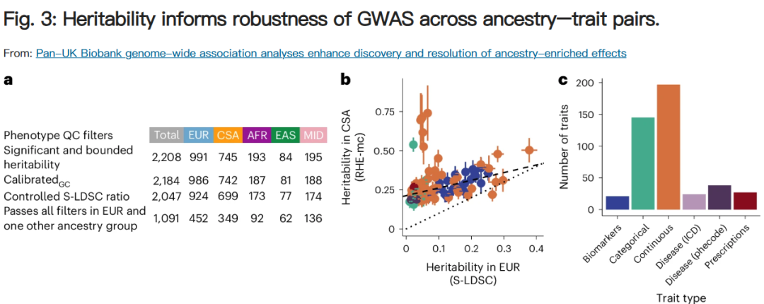 为了提高跨性状和祖先分析的可信度,设计了一种 QC 策略,系统地标记具有潜在问题 GWAS 结果的性状,同时保留两个或多个群体中通过 QC 的遗传性状的 GWAS,并确定了种群之间遗传力估计的相对幅度的一致性。