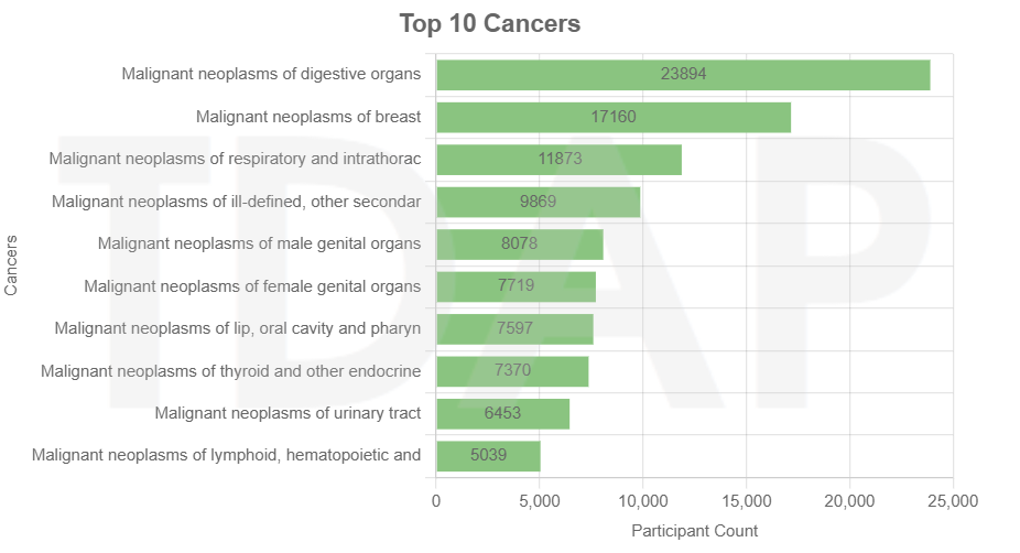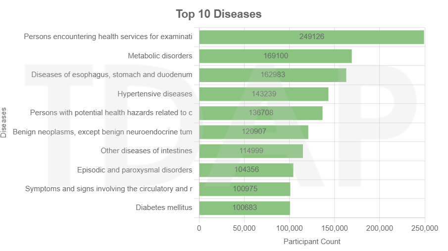 TPMI Data View数据基于 501,631 名参与者的统计结果,反映了台湾地区慢性病和传染病对公共健康的主要影响。高血压、心脏病和糖尿病是最常见的死亡相关疾病,影响超过半数参与者。肺癌竟然排第三位,可能和空气质量好有相关性?