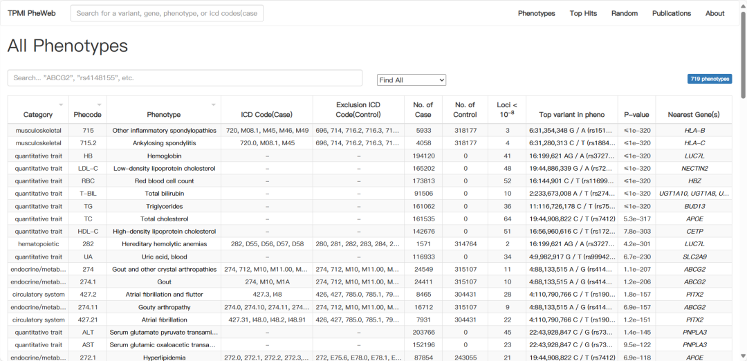 719种表型与基因变异的关联分析结果