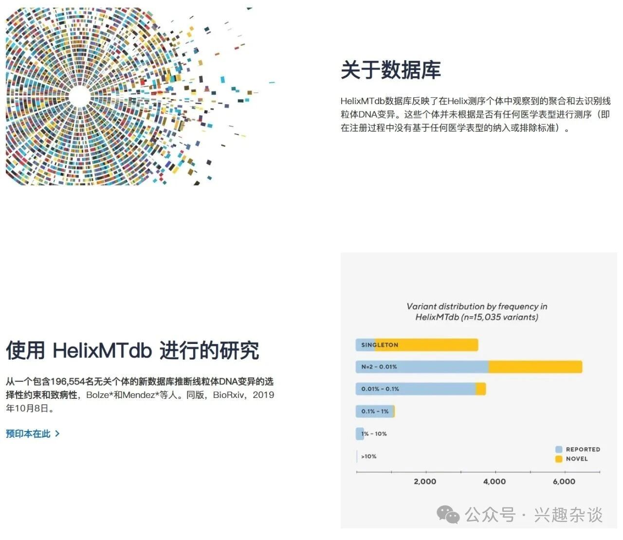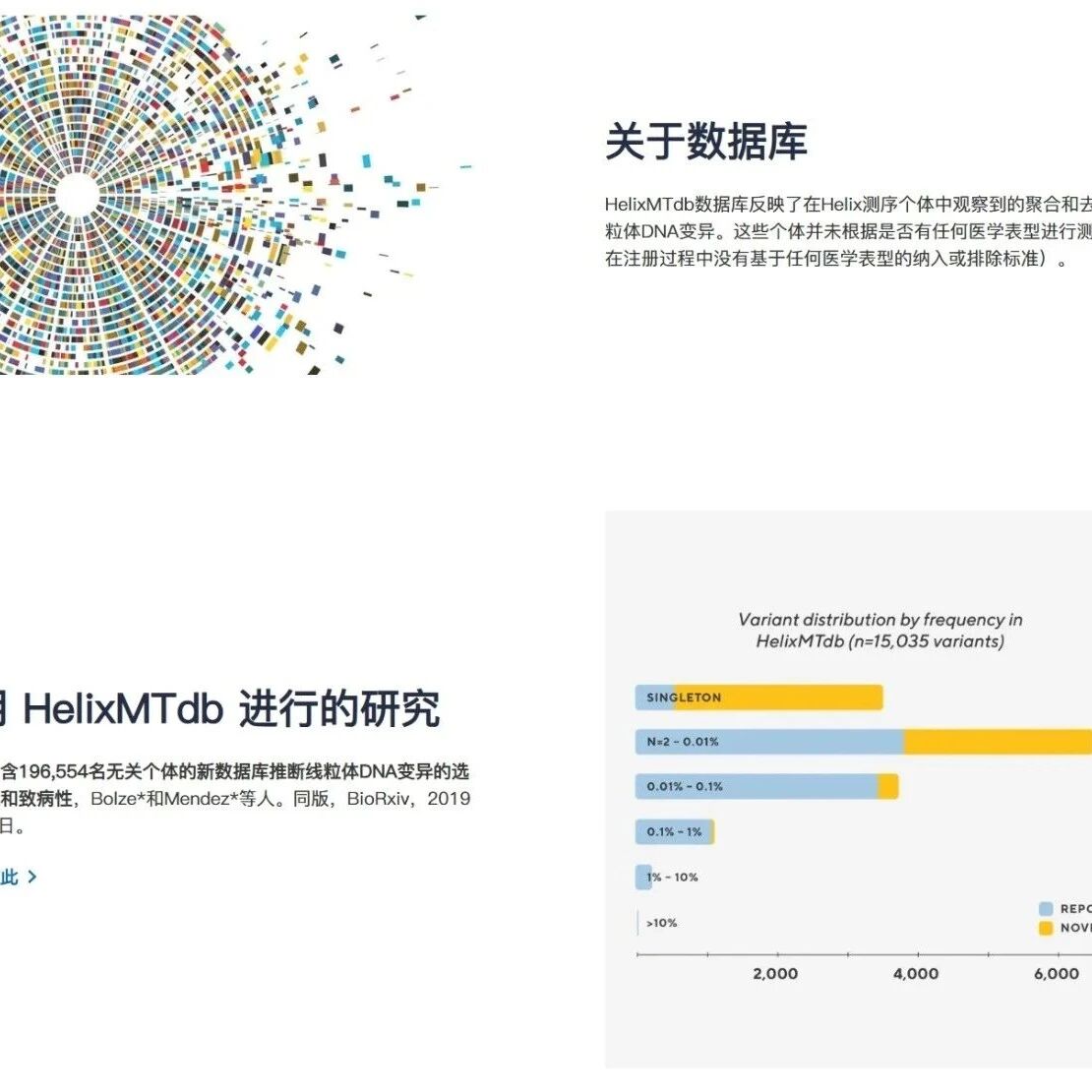 最大的公开人线粒体变异数据库HelixMTdb,195,983名无关个体中识别出的所有mtDNA变异的研究资源<br>https://www.helix.com/mitochondrial-variant-database<br>ppt: https://cdn.sanity.io/files/g5irbagy/production/960b88f3fd681a6207e9d18b9973e99fa6df9e1f.pdf<br>https://www.biorxiv.org/content/10.1101/798264v3<br>https://www.mitomap.org/MITOMAP